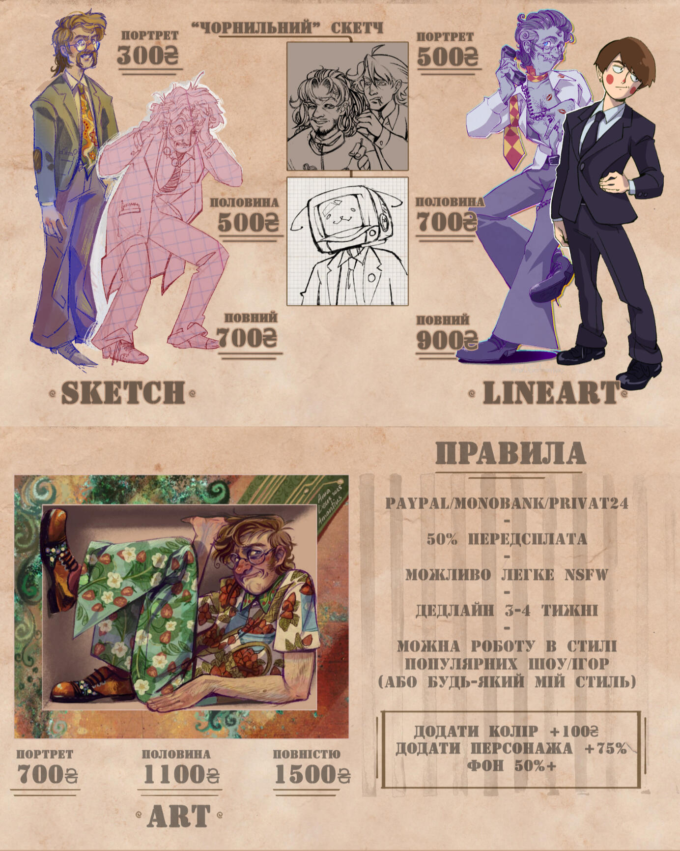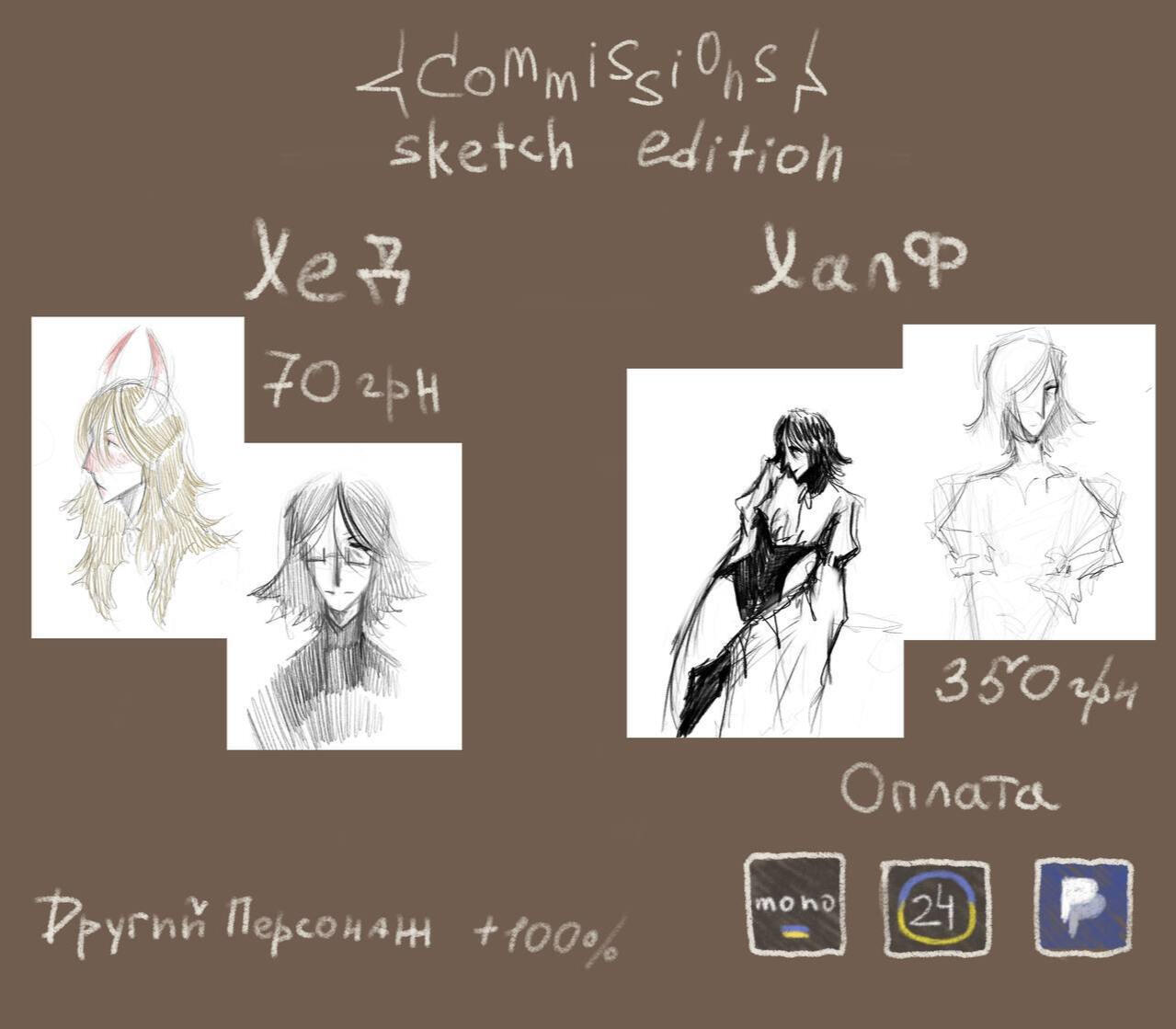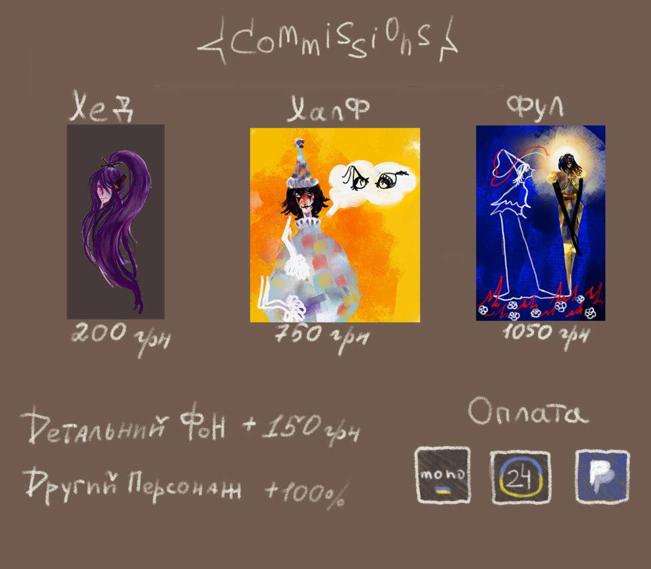 Portrait 300 UAH / halfbody 500 UAH/ fullbody 700 UAH