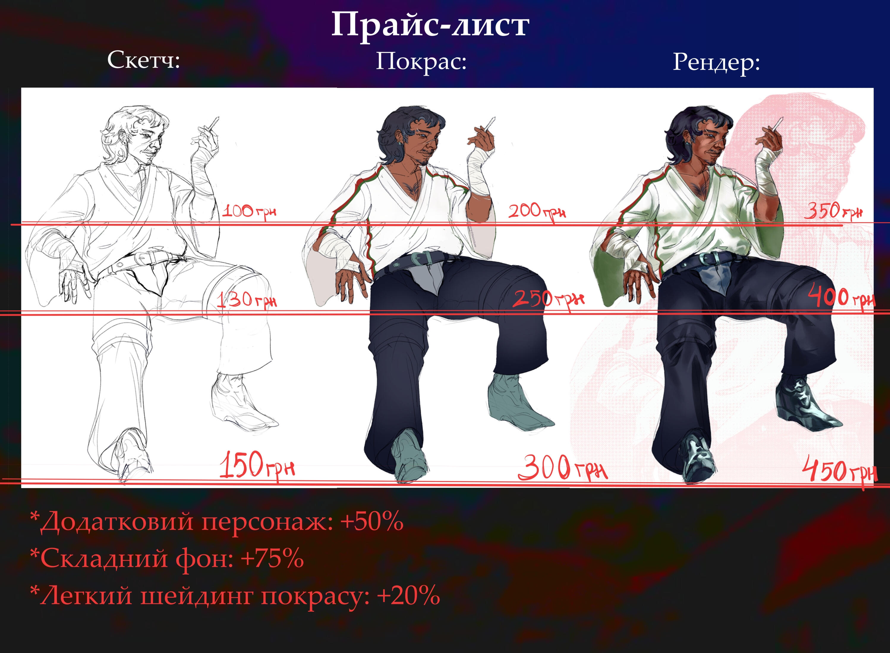 Portrait 300 UAH / halfbody 400 UAH/ fullbody 500 UAH