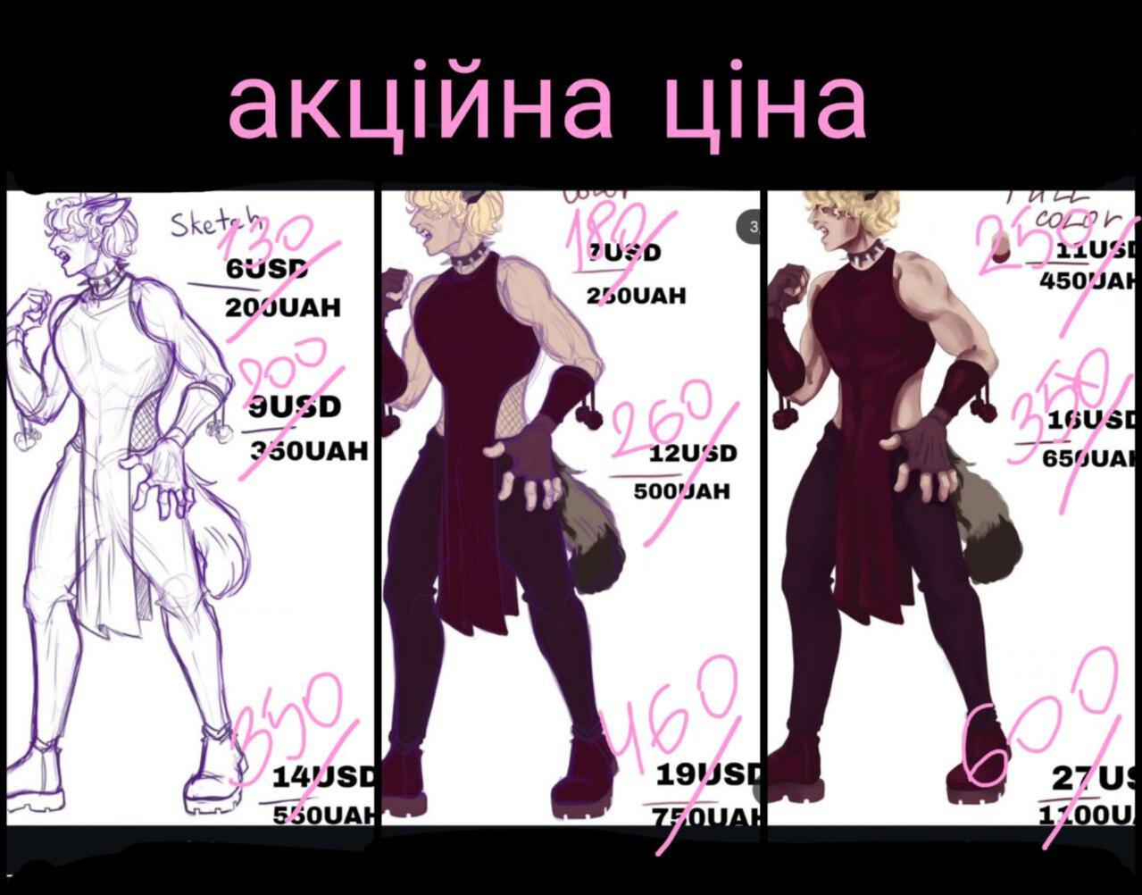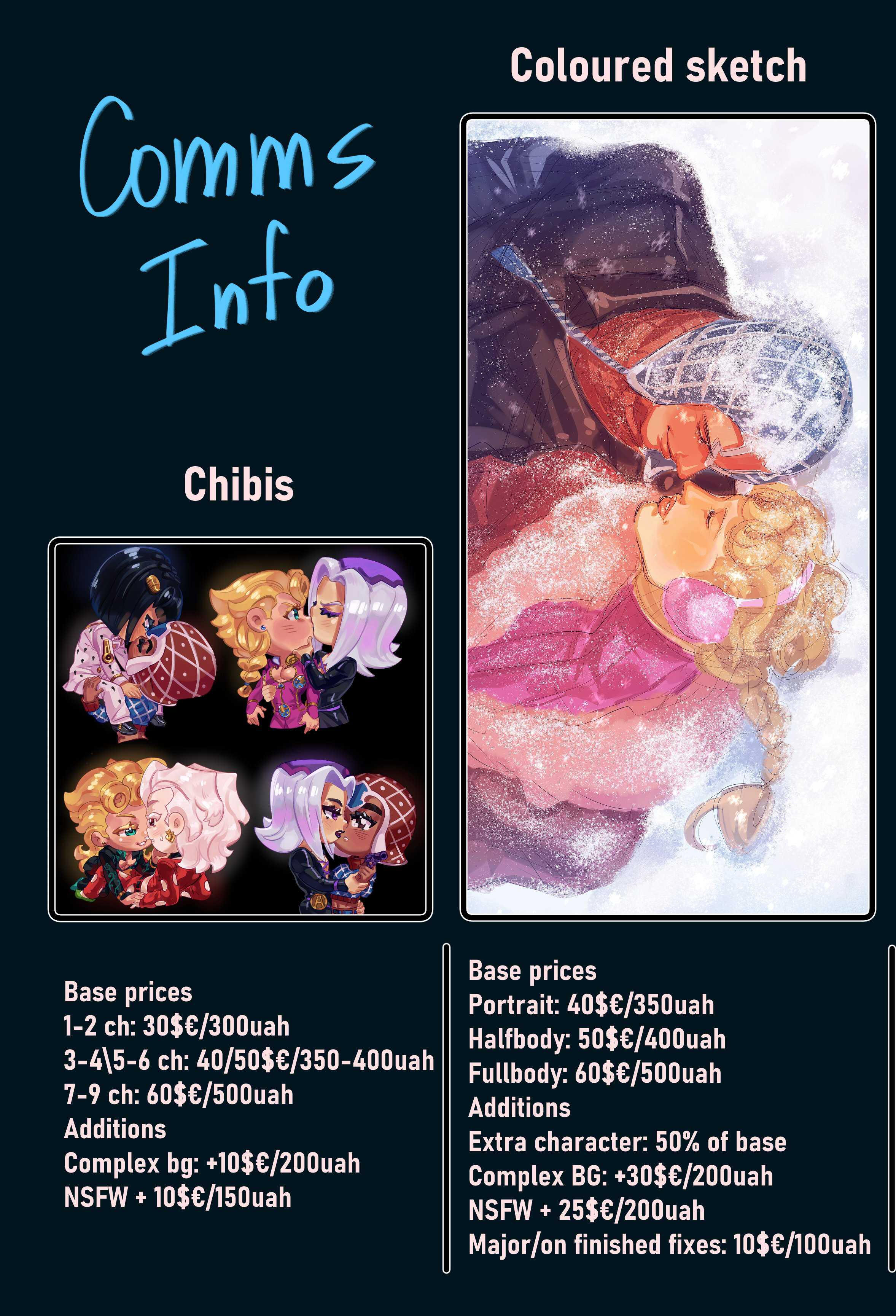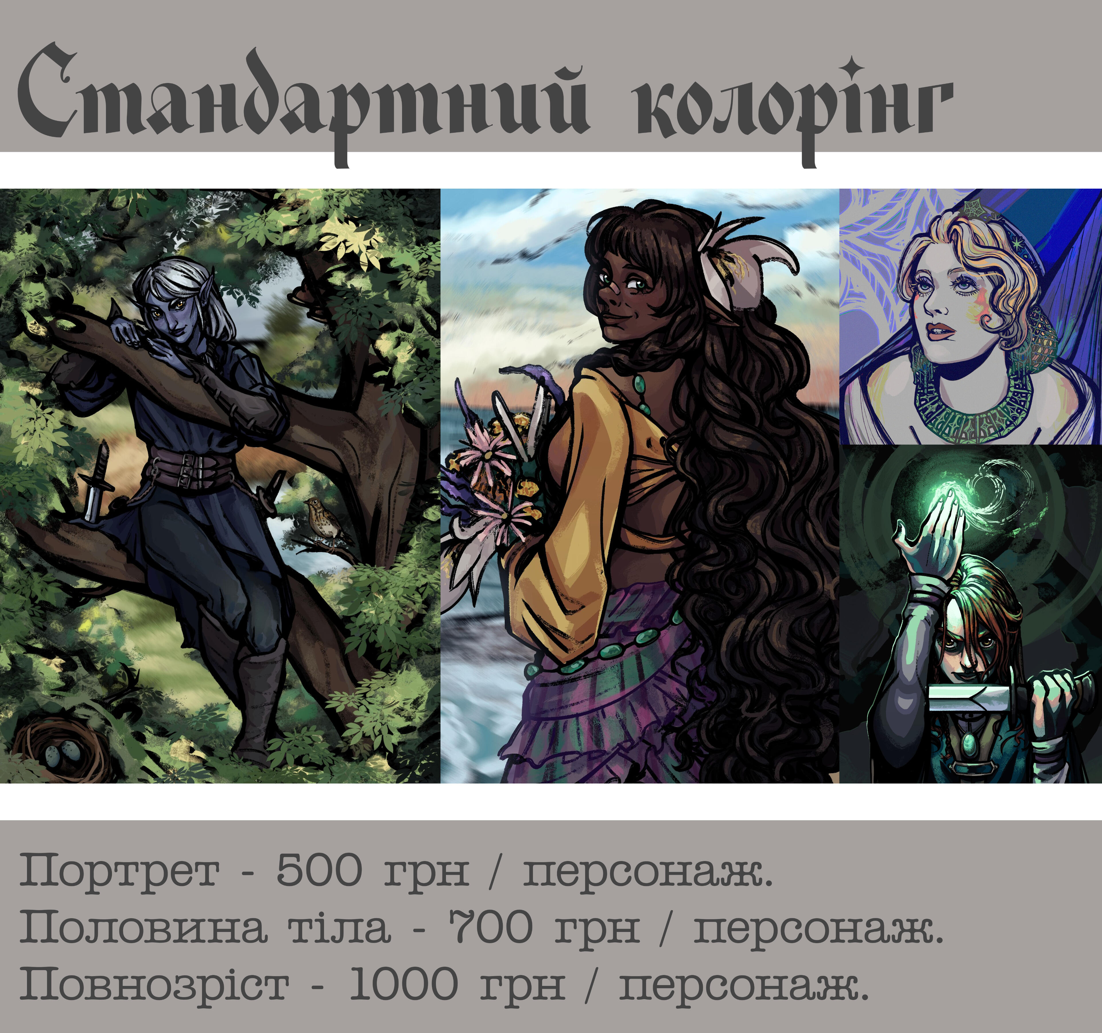 Portrait 500 UAH / halfbody 700 UAH/ fullbody 1000 UAH per character