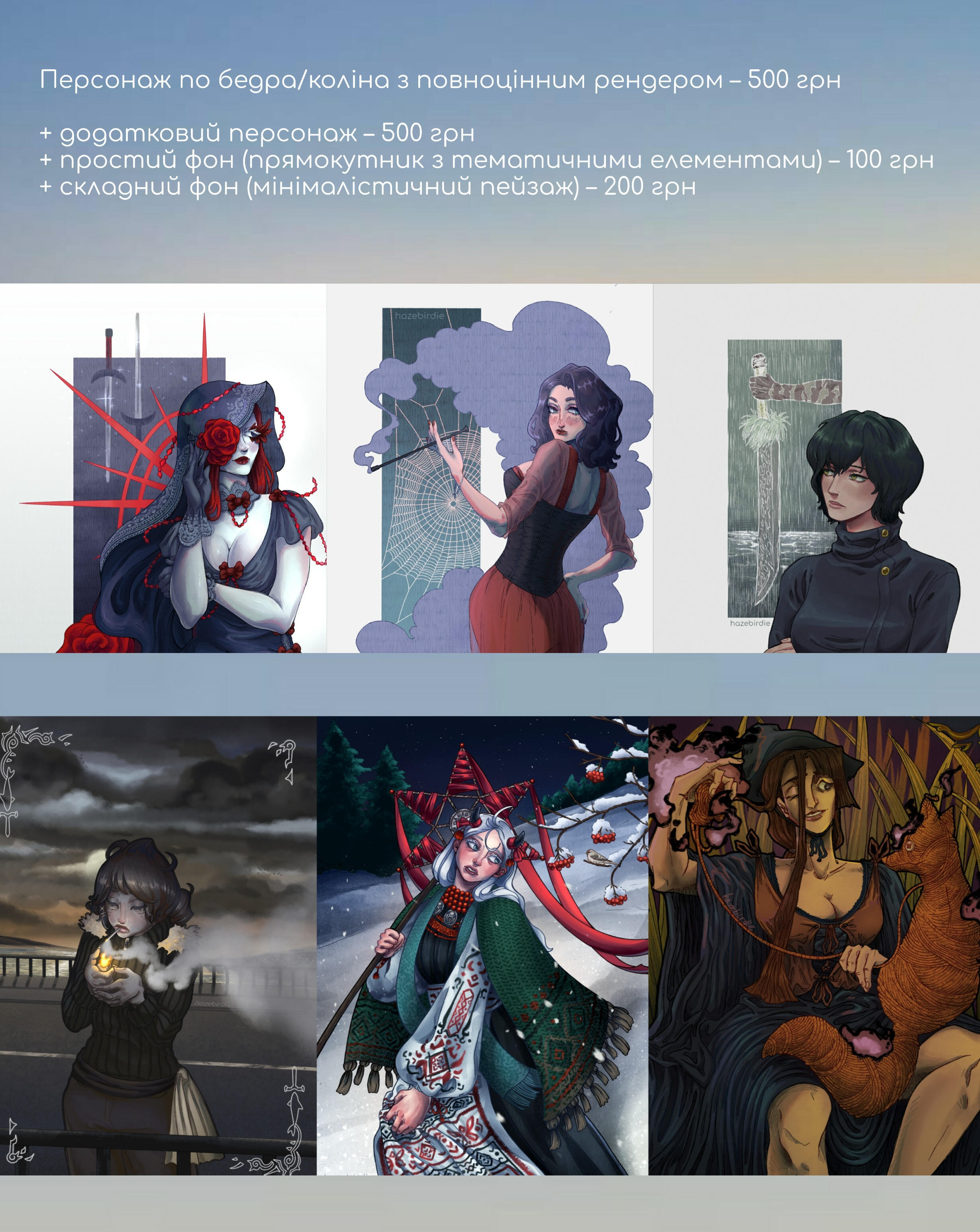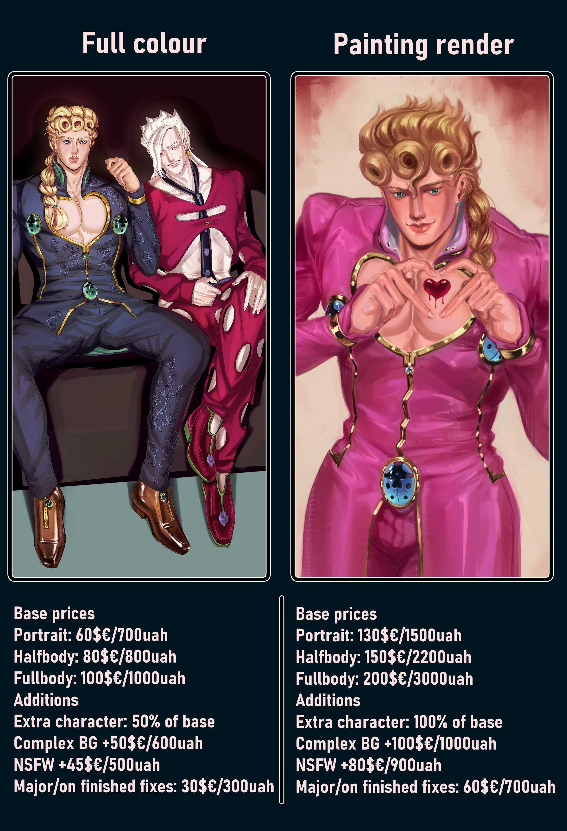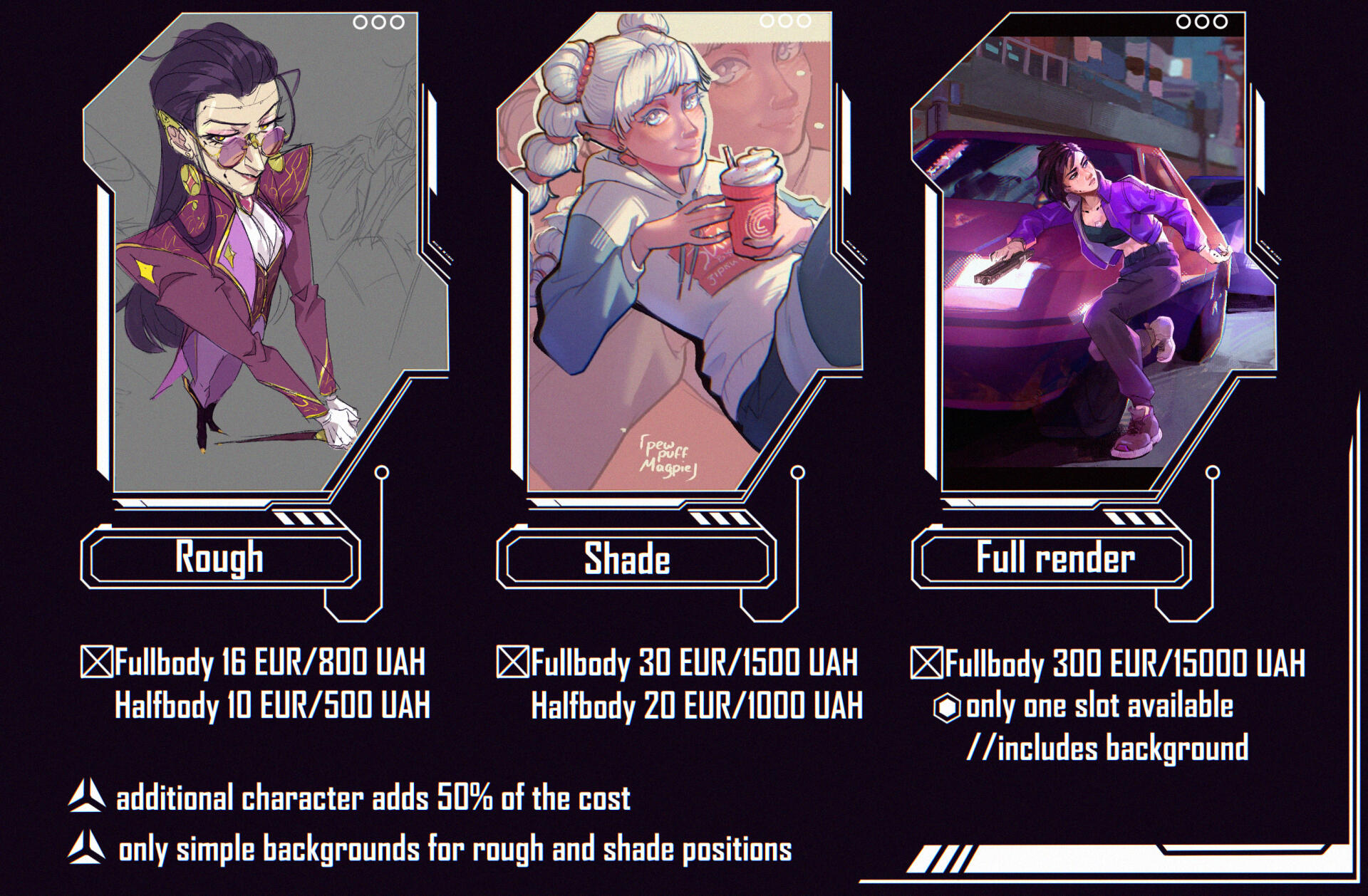 Portrait 1200 UAH / halfbody 1600 UAH/ fullbody 2000 UAH per character