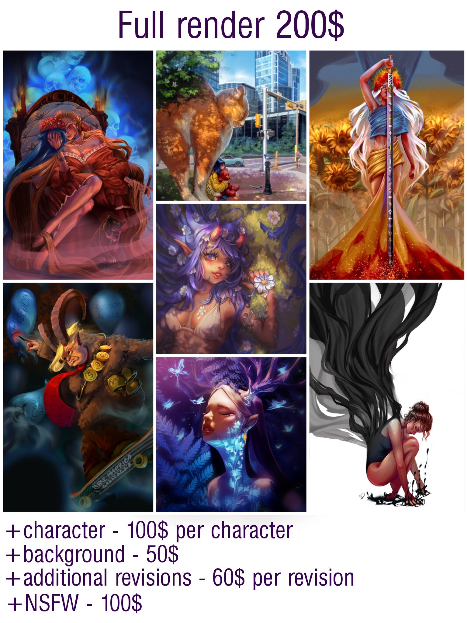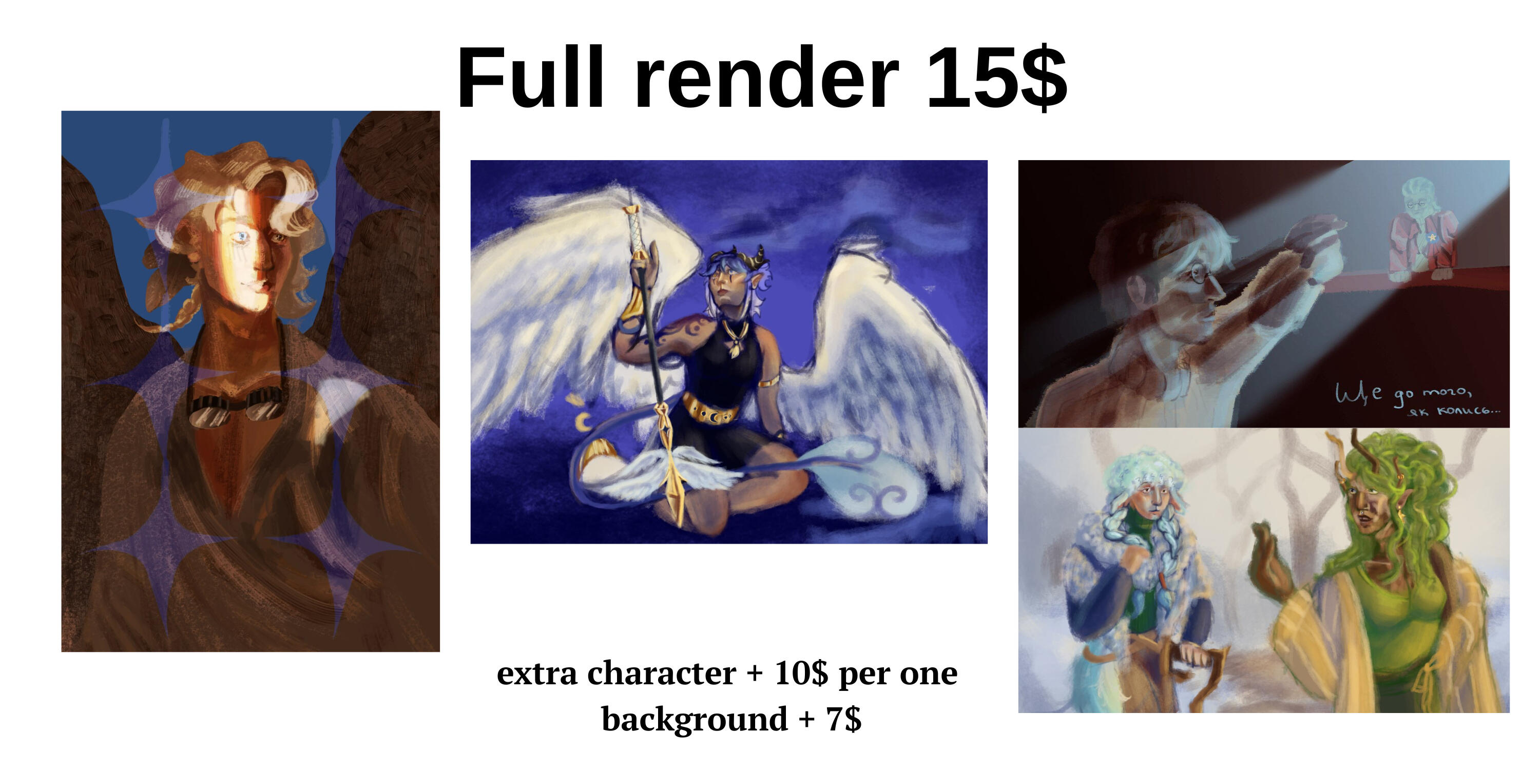 Portrait 200 UAH / halfbody 750 UAH/ fullbody 1050 UAH per character