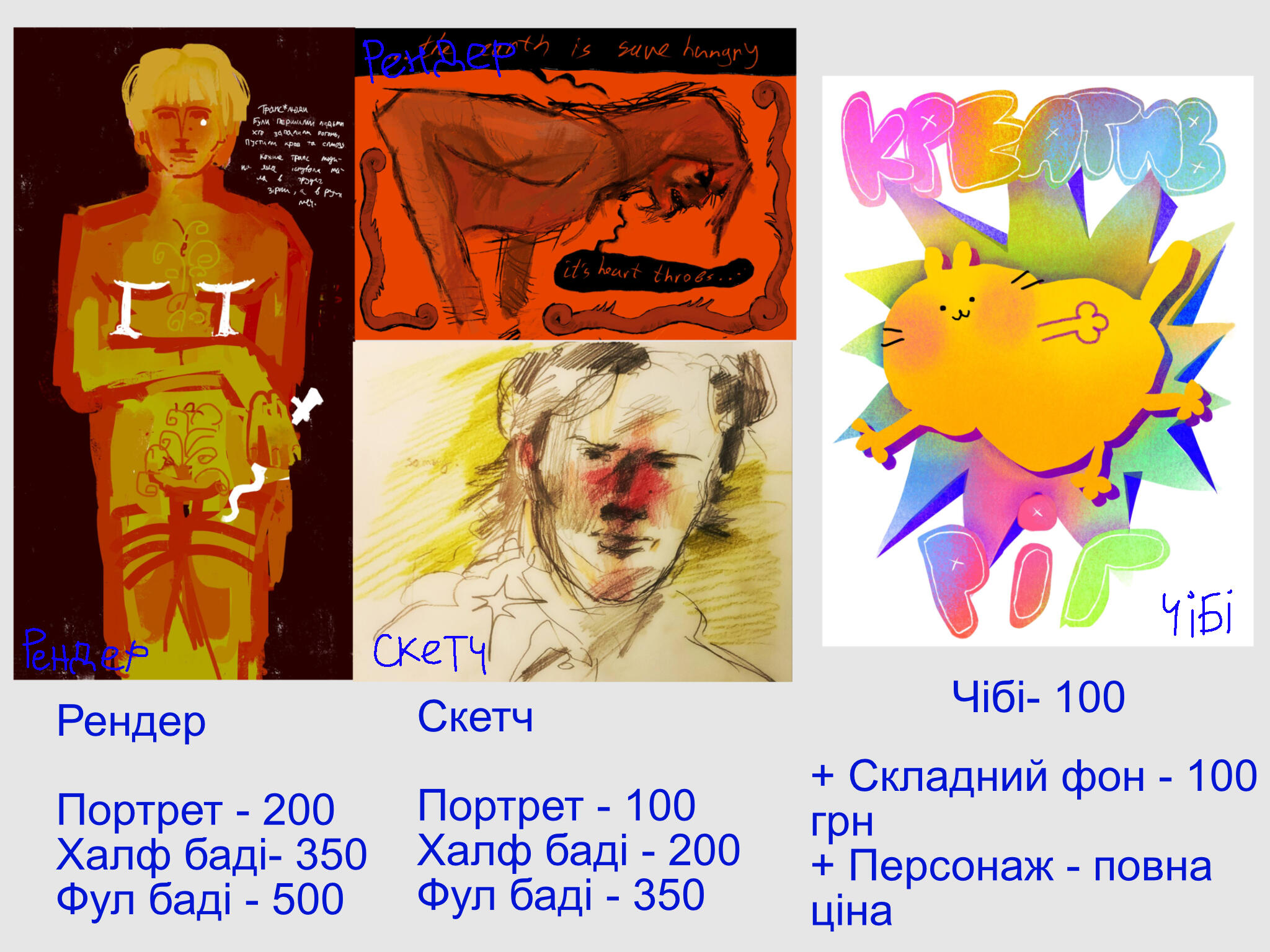 Portrait 100 UAH / halfbody 130 UAH/ fullbody 150 UAH