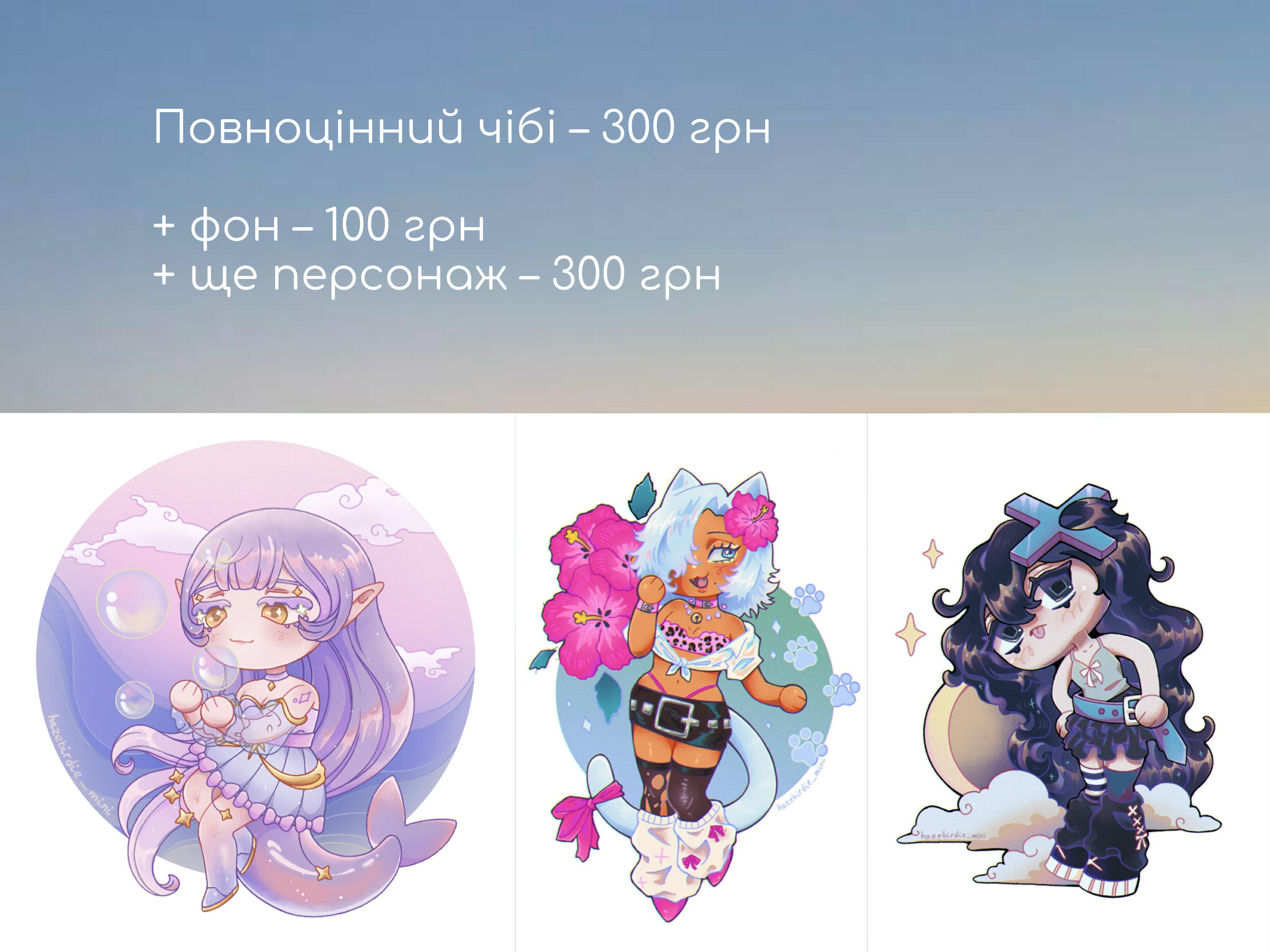 Portrait 200 UAH / halfbody 250 UAH/ fullbody 300 UAH